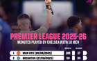 切尔西本赛季英超十人作战累计330分37秒,为所有球队最多
